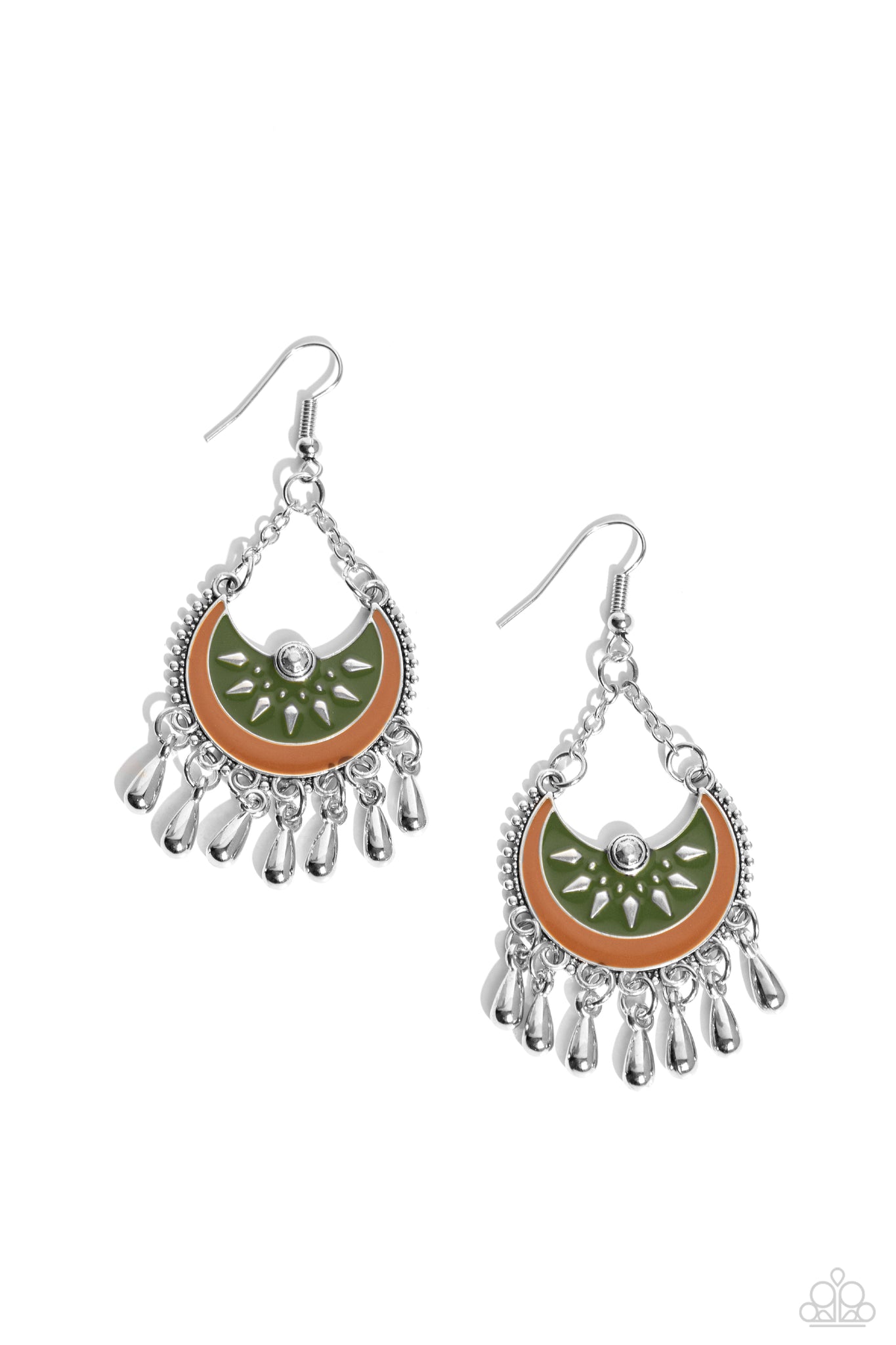 Silver teardrop beads dance from the bottom of a studded silver crescent frame that is suspended from dainty silver chains. Featuring silver petal-like accents, the rustic frame is painted in Olive Green and brown finishes for an earthy pop of color. Earring attaches to a standard fishhook fitting.