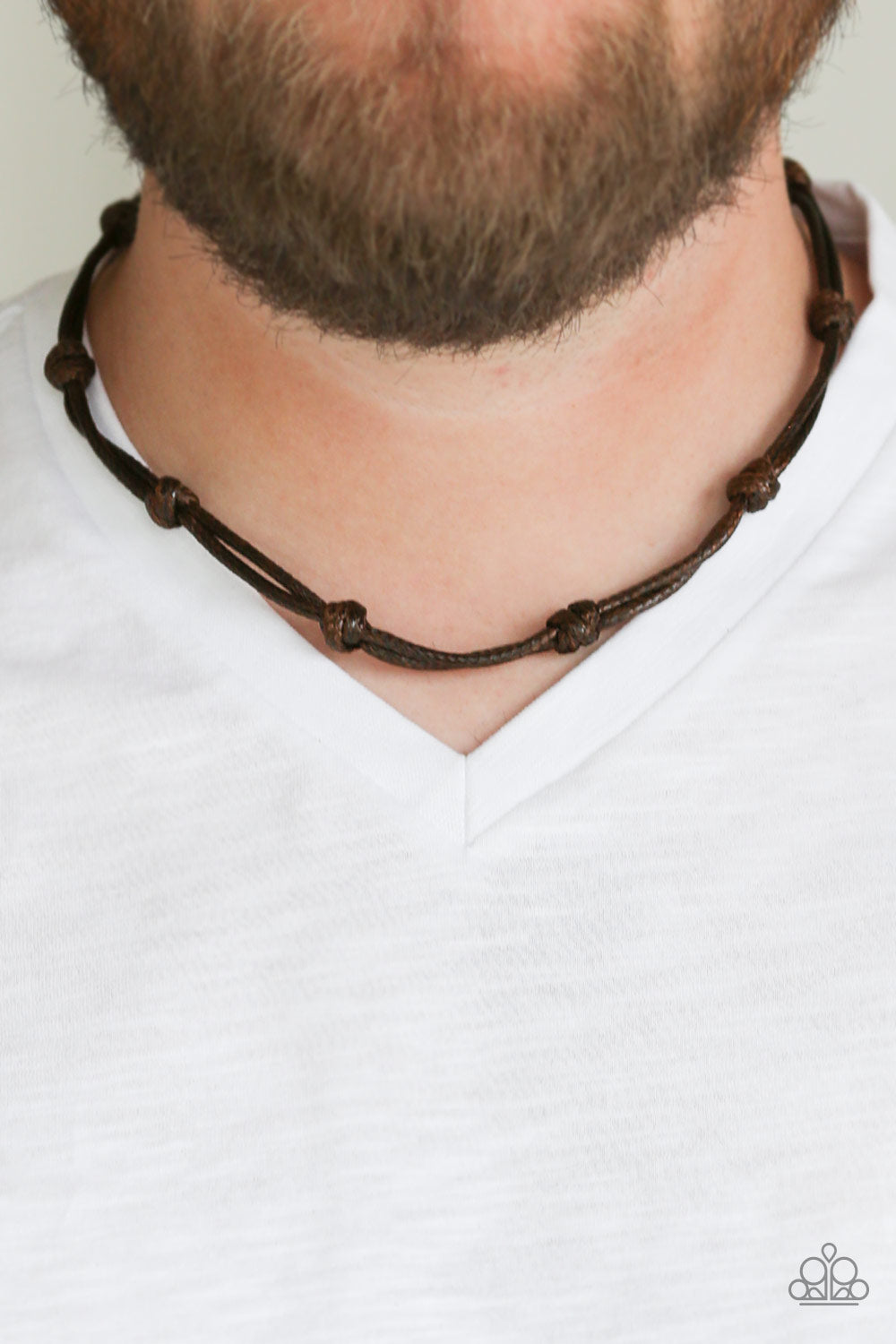 Shiny strands of brown cording knot below the collar for a seasonal look. Features a button loop closure.