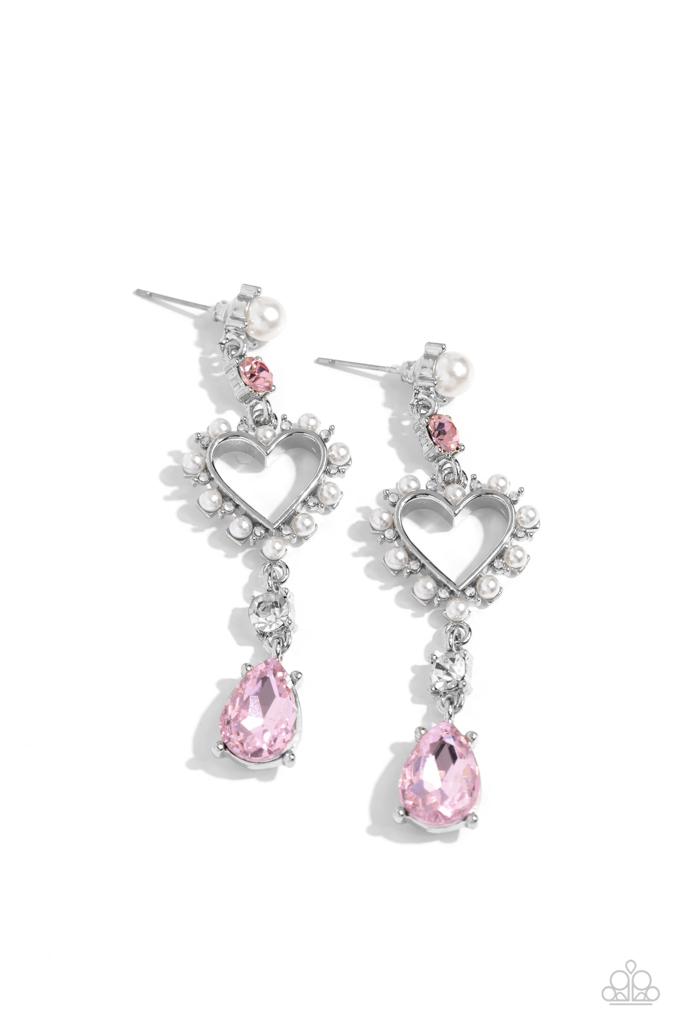 A white pearl and pink gem are pronged in silver fittings as they give way to an airy heart frame embellished with dainty white pearls and iridescent rhinestones for a dreamy finish. A white gem and pink teardrop gem, pressed in the same pronged fittings, dramatically swing from the bottom of the airy heart frame, capturing and reflecting light at every hypnotic sway. Earring attaches to a standard post fitting. Due to its prismatic palette, color may vary.