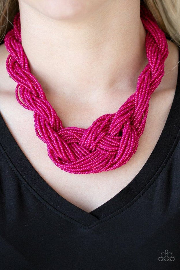 Countless strands of pink seed beads are twisted and knotted together to create an unforgettable statement piece. Features an adjustable clasp closure.