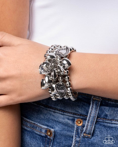 Infused along elastic stretchy bands, strands of subtly-textured, glistening silver beads stack up the wrist, creating a radiantly layered display. A collection of silver hearts in varying sizes and studded motifs sporadically dots atop the strands for a heartfelt finish.