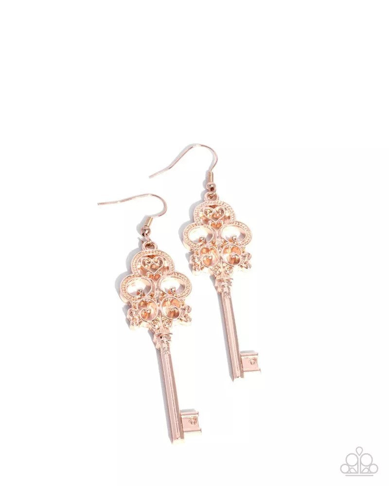 Antique-inspired rose gold keys feature intricate filigree details and heart-shaped accents at the top for a vintage charm. Earring attaches to a standard fishhook fitting.