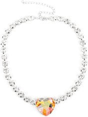 A dramatically oversized heart-shaped gem with a reflective, iridescent orange finish glitters at the center of a blinding row of glassy white rhinestones, resulting in a flirtatious sparkle around the neck. Features an adjustable clasp closure. Due to its prismatic palette, color may vary.