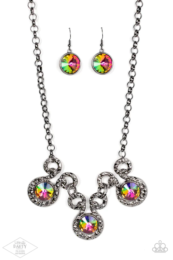 Three dramatically oversized oil spill rhinestones are nestled into three textured gunmetal fittings that are connected by oval gunmetal rings, creating a brilliant statement piece. Features an adjustable clasp closure.
