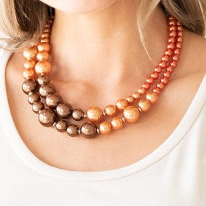 Infused with dainty silver accents, classic orange and brown pearls layer below the collar in a timeless fashion. Features an adjustable clasp closure. Sold as one individual necklace. Includes one pair of matching earrings.