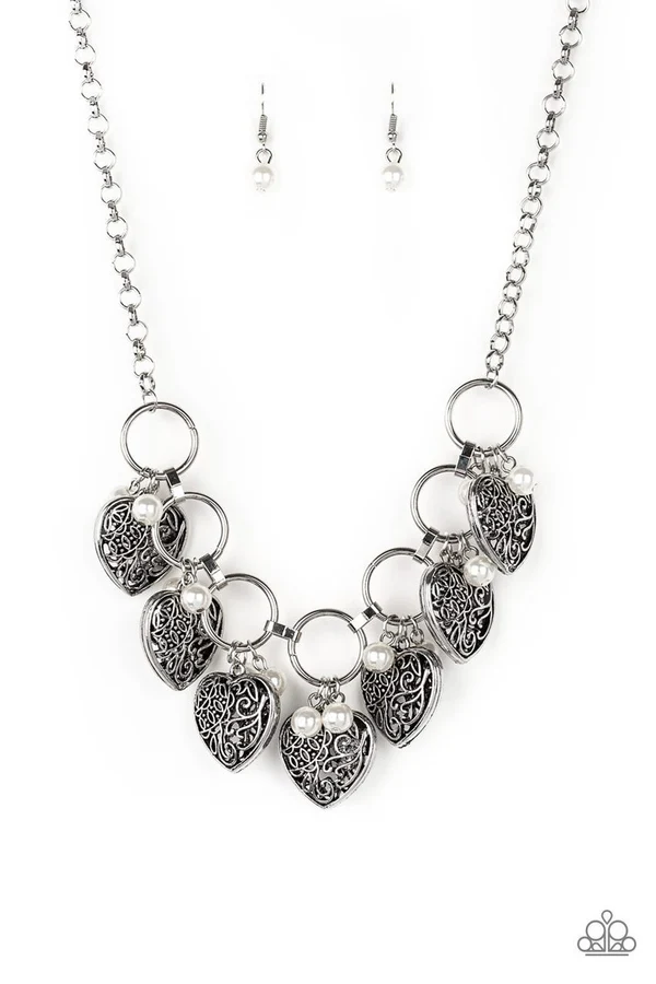Infused with classic purple pearls, vintage locket-like heart frames swing from the bottoms of bold silver hoops, creating a flirtatious fringe below the collar. Features an adjustable clasp closure.