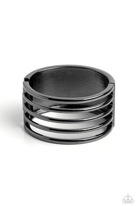 Stemming from a thick black cuff, glistening bars of black arc across the top of the wrist for a warrior-worthy finish. Features a hinged closure.