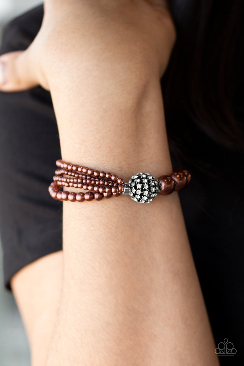 Featuring stretchy bands, a white rhinestone encrusted silver bead joins together strands of mismatched brown pearls and a single strand of classic brown pearls around the wrist for a timeless twist.